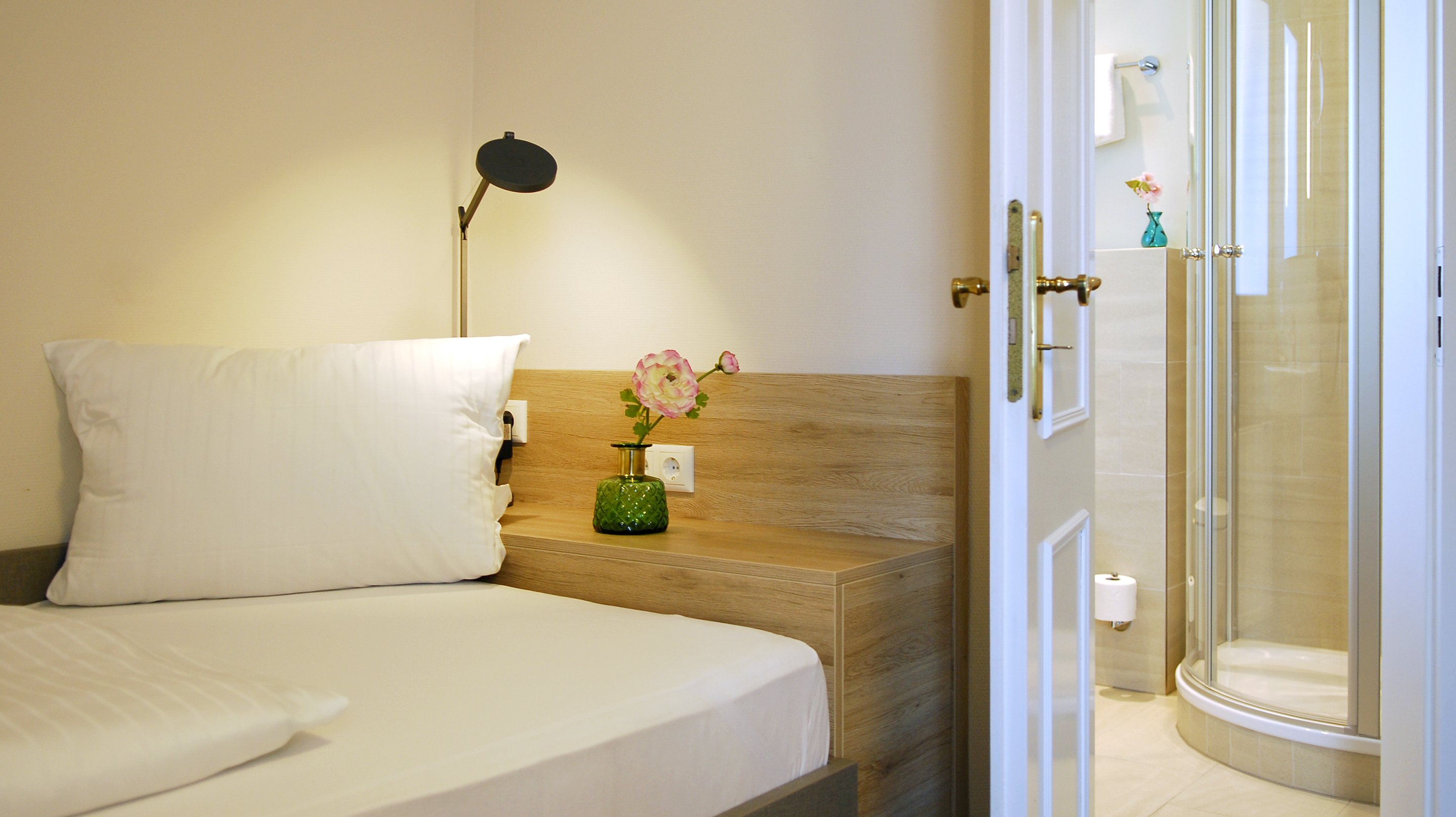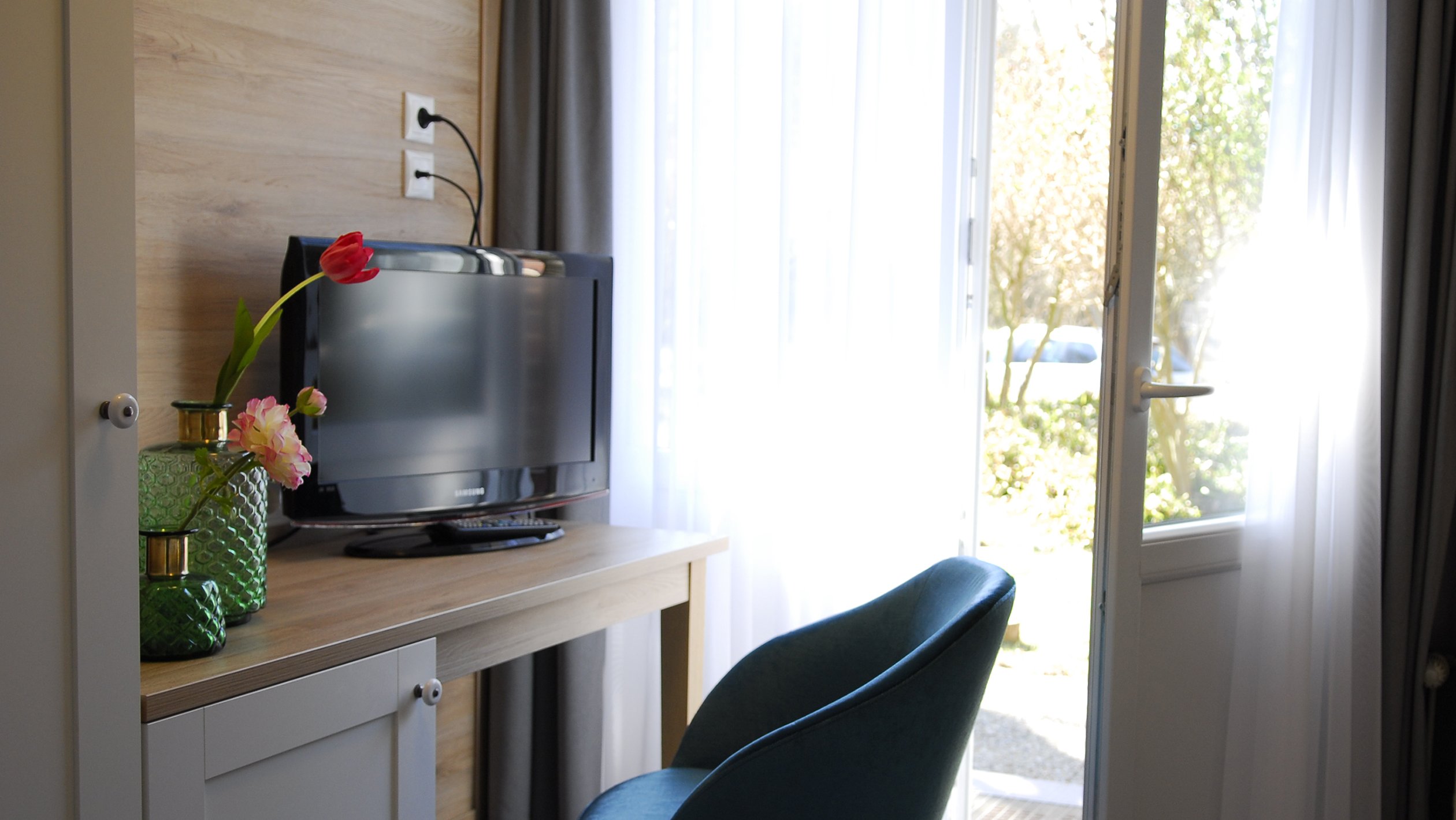 Alle Zimmer im Haus am Wäldchen fallen sofort durch Ihre markanten blauen Samtstühlen auf und erwarten unsere Gäste mit modernen Bädern. Zum Frühstücksraum, Sauna und zur Rezeption gelangen Sie zu jeder Jahreszeit gemütlich durch unseren unterirdischen Verbindungsgang. Treten Sie ein....