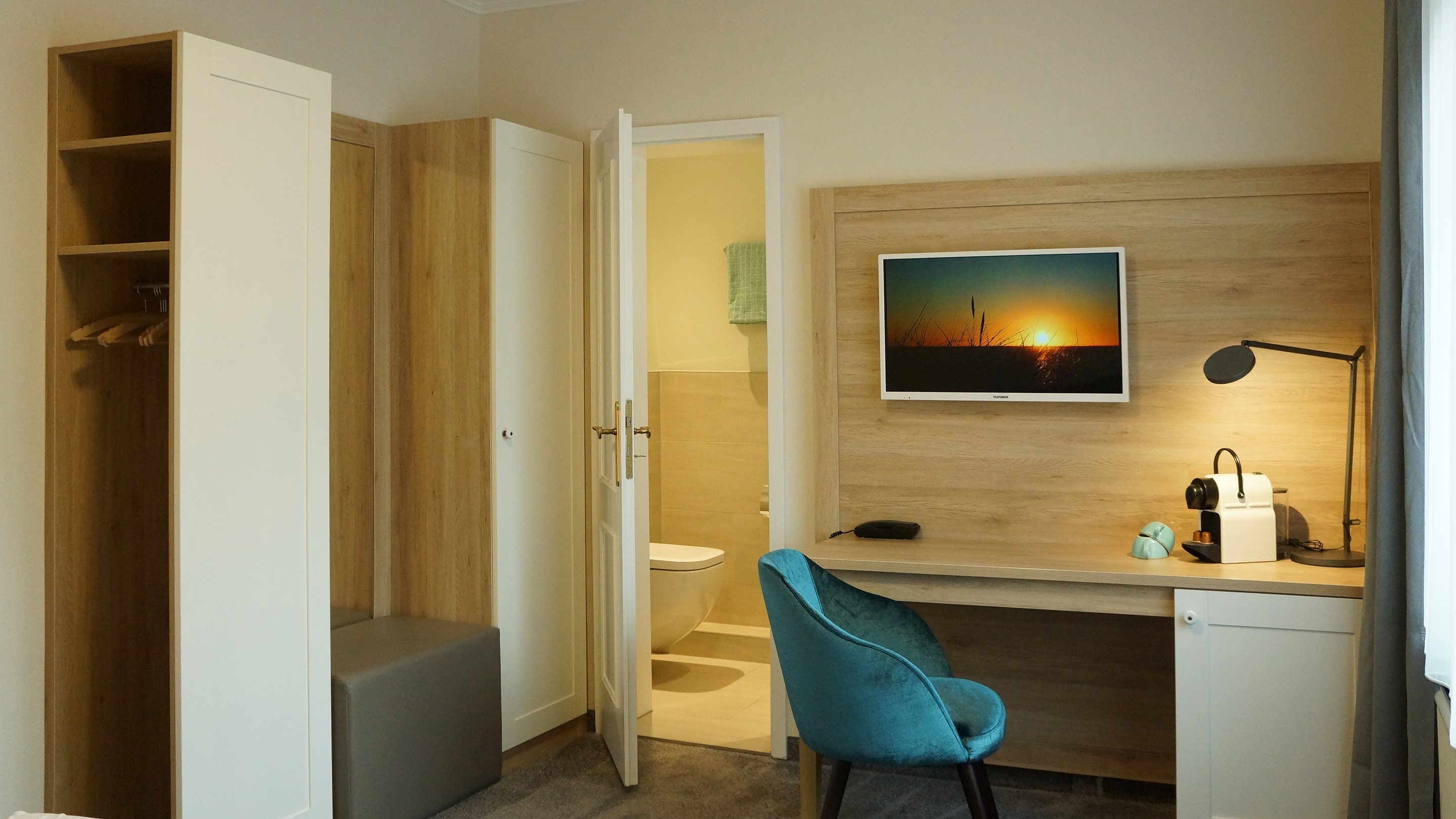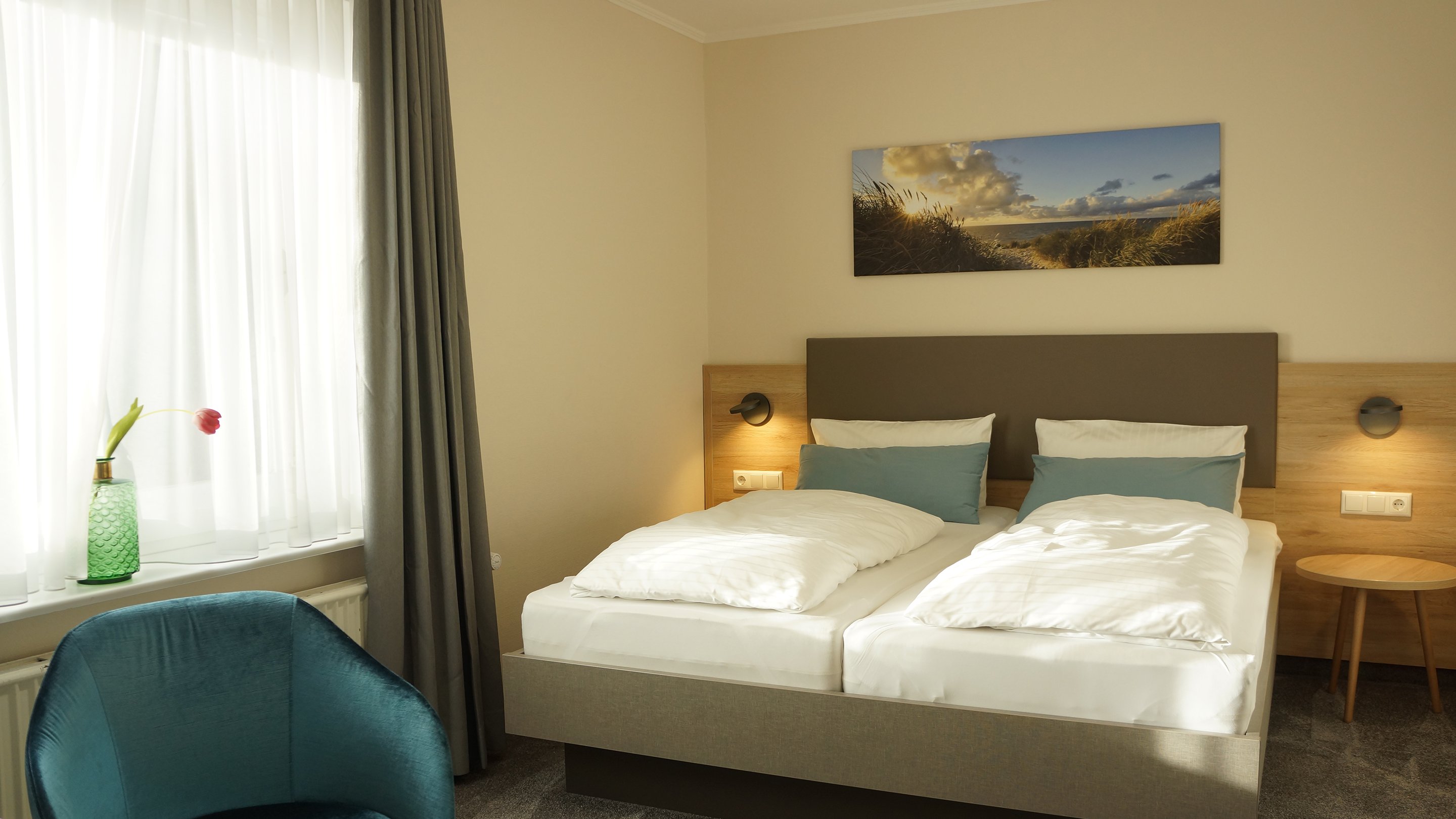 Alle Zimmer im Haus am Wäldchen fallen sofort durch Ihre markanten blauen Samtstühlen auf und erwarten unsere Gäste mit modernen Bädern. Zum Frühstücksraum, Sauna und zur Rezeption gelangen Sie zu jeder Jahreszeit gemütlich durch unseren unterirdischen Verbindungsgang. Treten Sie ein....
